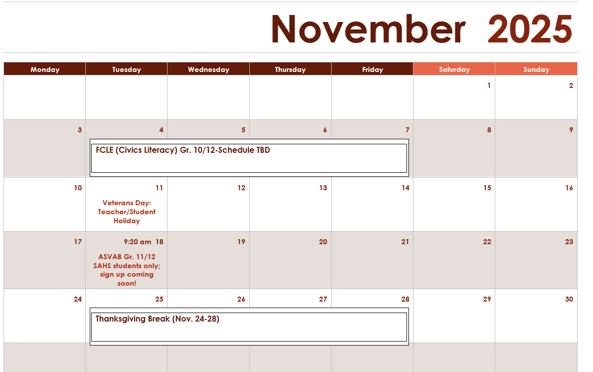 - PSAT Information for SAHS, 10/22/25, All Grade 10, and registered/paid gr. 9/11; Registration is closed.
